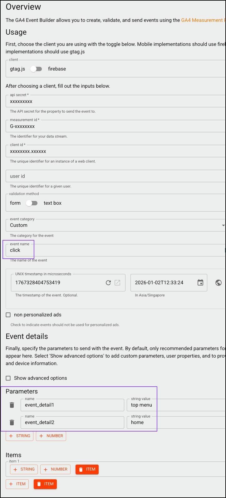 To send an event to MP, you first need to construct the event and event parameters in JSON format. Whether you want to send a simple event (eg. click) or something more complex (eg. select_promotion with the ecommerce items object), you may use this tool to help you construct the JSON format: