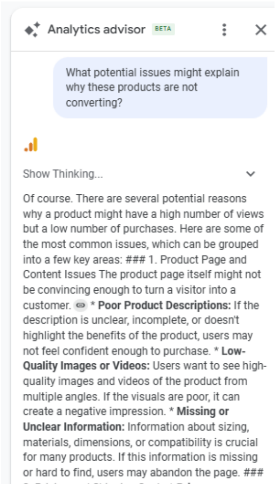 As the engine is powered by Gemini, some technical limitations remain. It may be suitable for the Gemini UI, but it may look a bit awkward in the Analytics Advisor UI. For example, responses can be overly long, without clear paragraph breaks. In addition, links included in responses often lead to general help pages rather than property-specific guidance.